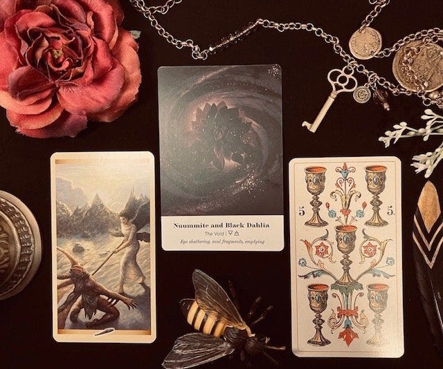 Recently I came across an Oracle card “The Void” and it speaks of Nuummite and Black Dahlia. The words, “ego shattering, soul fragments, emptying” written across the bottom. The image contains this beautiful flower swirling in the purple black darkness. I began to shake, as it gave me such a strong resonance, and I knew it was finally time to share this part of my experience.